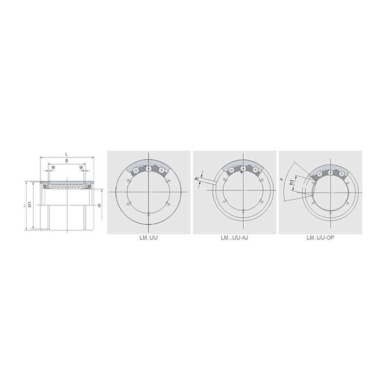 | LM … UU | วงจรลูกบอล | น้ำหนัก (กิโลกรัม) | LM … UU-AJ | วงจรลูกบอล | น้ำหนัก | lm … uu-op | วงจรลูกบอล | น้ำหนัก (กิโลกรัม) | มม. | มม. | ความอดทน | ความอดทน | d mm | ความอดทน (μm) | l mm | ความอดทน (μm) | b mm | ความอดทน (μm) | W (มม.) | D1 (มม.) | อืม) | H1 (มม.) | θ | ความแม่นยำ | สูง | พลวัต | คงที่ | |