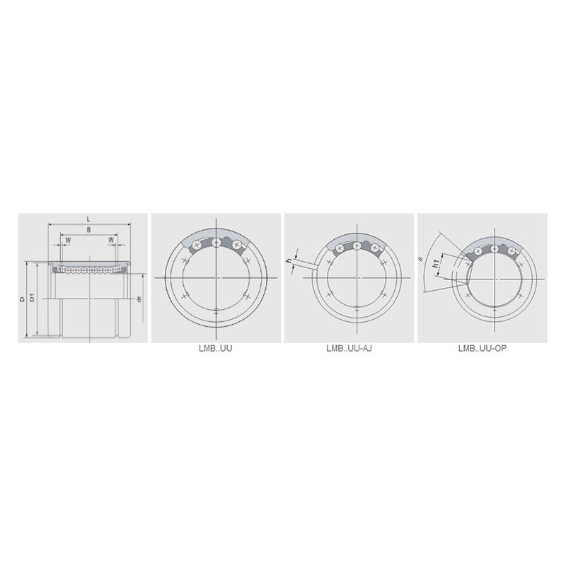 | LMB … UU | วงจรลูกบอล | น้ำหนัก (กิโลกรัม) | LMB … UU-AJ | วงจรลูกบอล | น้ำหนัก | lmb … uu-op | วงจรลูกบอล | น้ำหนัก (กิโลกรัม) | นิ้ว | มม. | นิ้ว | มม. | ความแม่นยำ (นิ้ว) | ความแม่นยำ (μM) | สูง (นิ้ว) | สูง (μm) | D (นิ้ว/มม.) | ความอดทน d (นิ้ว) | D Tolerance (μm) | l (นิ้ว/มม.) | L Tolerance (นิ้ว) | L Tolerance (μm) | B (นิ้ว/มม.) | B Tolerance (นิ้ว) | B Tolerance (μm) | W (นิ้ว/มม.) | D1 (นิ้ว/มม.) | H (นิ้ว/มม.) | H1 (นิ้ว/มม.) | θ | ความแม่นยำ | สูง | พลวัต | คงที่ | |